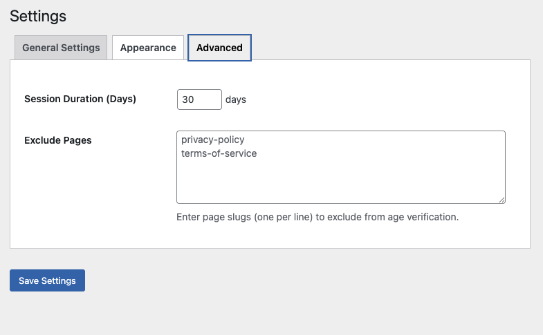Exclude specific pages like privacy policy, terms of service, or contact pages from age verification.